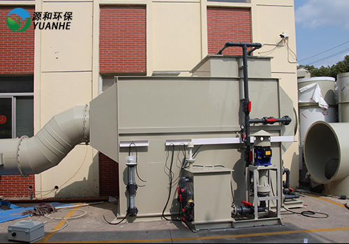 臥式洗滌塔,有害的廢氣從塔體的側部進入,臥式洗滌塔內部設有一定高度的填料層廢氣自橫穿過填料層,最后從塔另外一側排出。同時從塔體的上部設有噴淋系統,利用清水作循環吸收液,循環水從塔體的上部的布水器噴淋至填料層潤濕填料表面形成流動的液膜。填料層內氣、液兩相呈逆流流動,氣液兩項在塔內逆流接觸,利用有害廢氣在吸收劑中的一定的溶解度,可溶的組分不斷溶入吸收液中,達到降低氣體中有害組分含量的目的。配添加適當量的藥劑,有害廢氣不斷被吸收或是被化學反應去除掉,因此在水平氣流中的濃度愈來愈低,到塔側部時達到吸收要求排出塔外。
